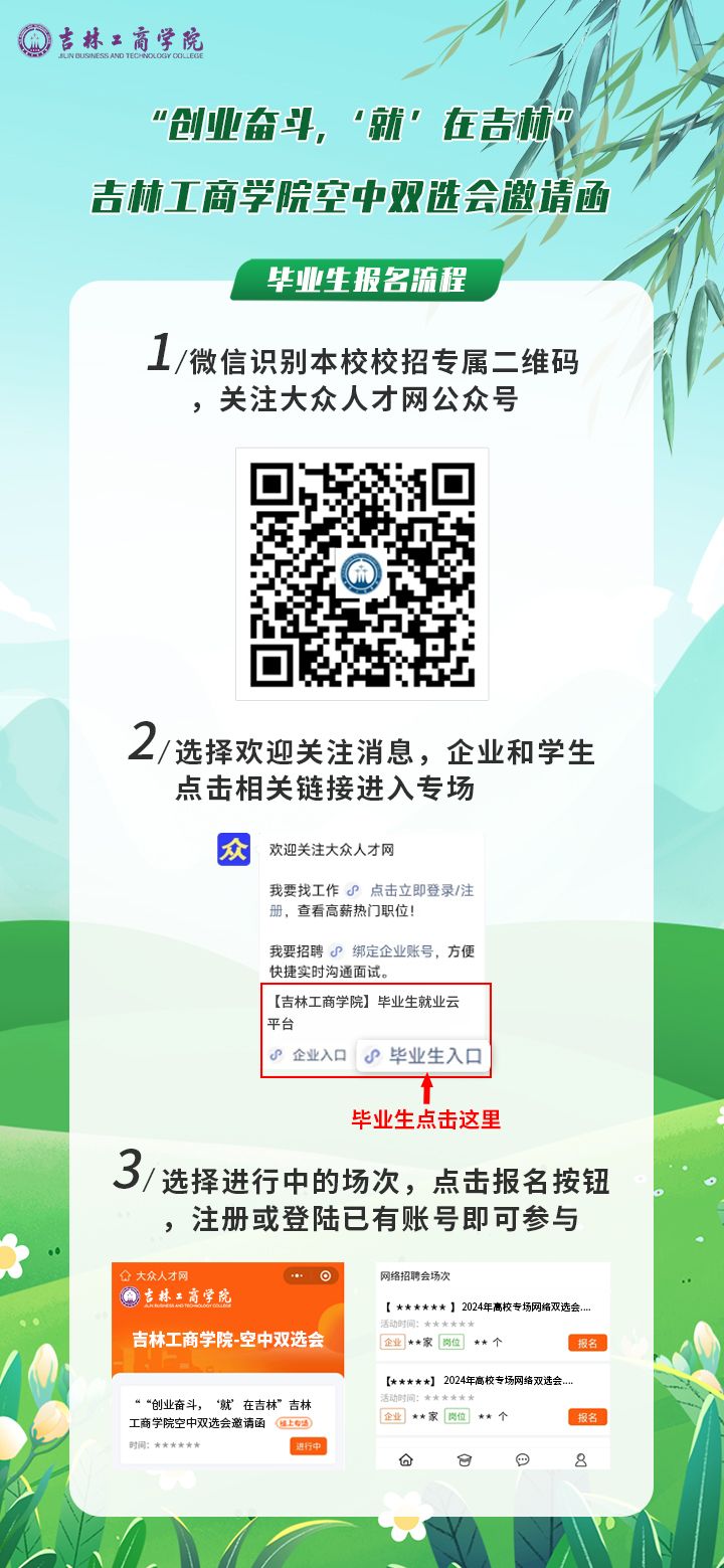 手机微信扫码关注“大众人才网”微信公众号,企业和毕业生分别点击相关按钮进入吉林工商学院校招端口,点击报名按钮,注册或登录已有账号即可直接参与。