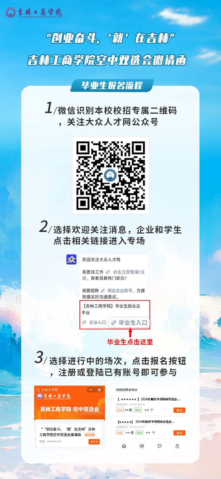 手机微信扫码关注“大众人才网”微信公众号,企业和毕业生分别点击相关按钮进入吉林工商学院校招端口,点击报名按钮,注册或登录已有账号即可直接参与。