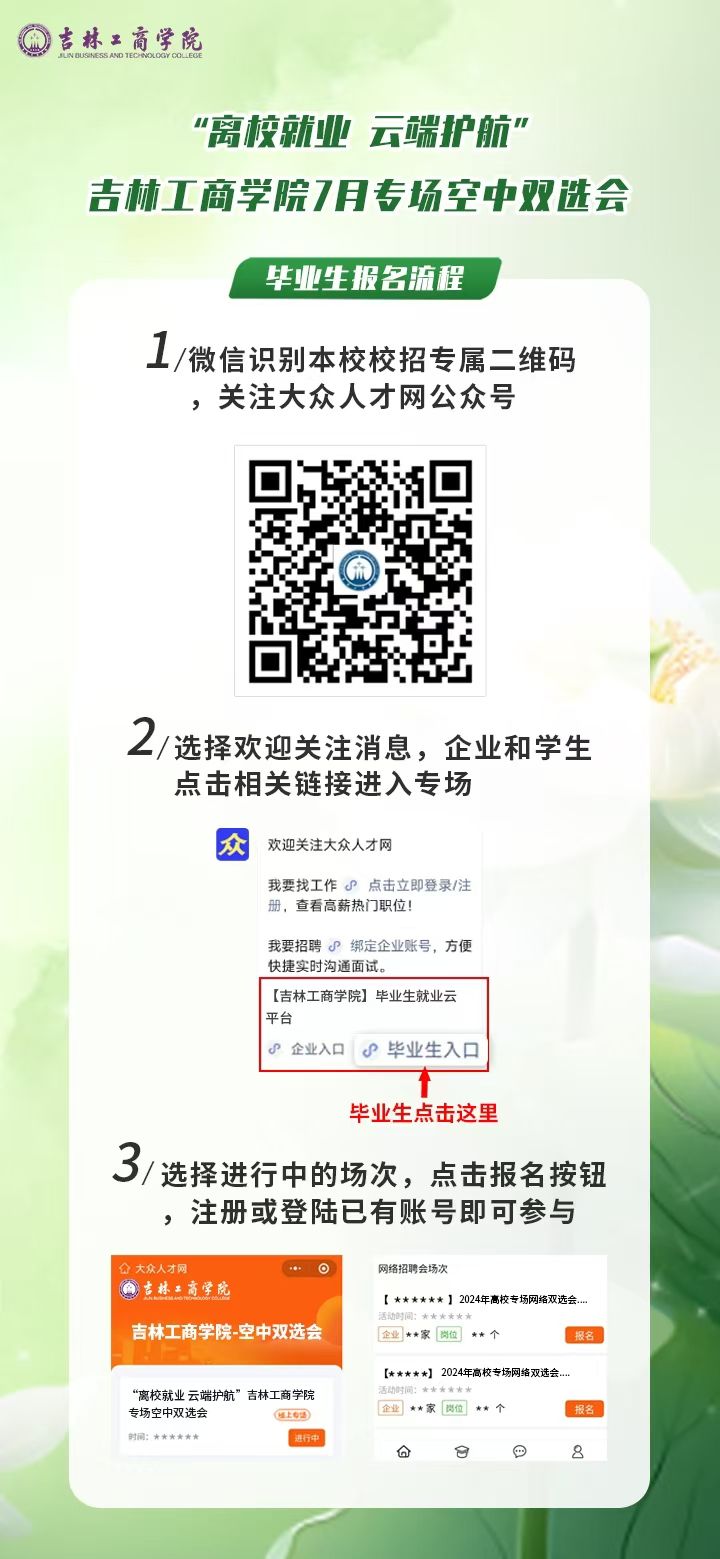 手机微信扫码关注“大众人才网”微信公众号,企业和毕业生分别点击相关按钮进入吉林工商学院校招端口,点击报名按钮,注册或登录已有账号即可直接参与。