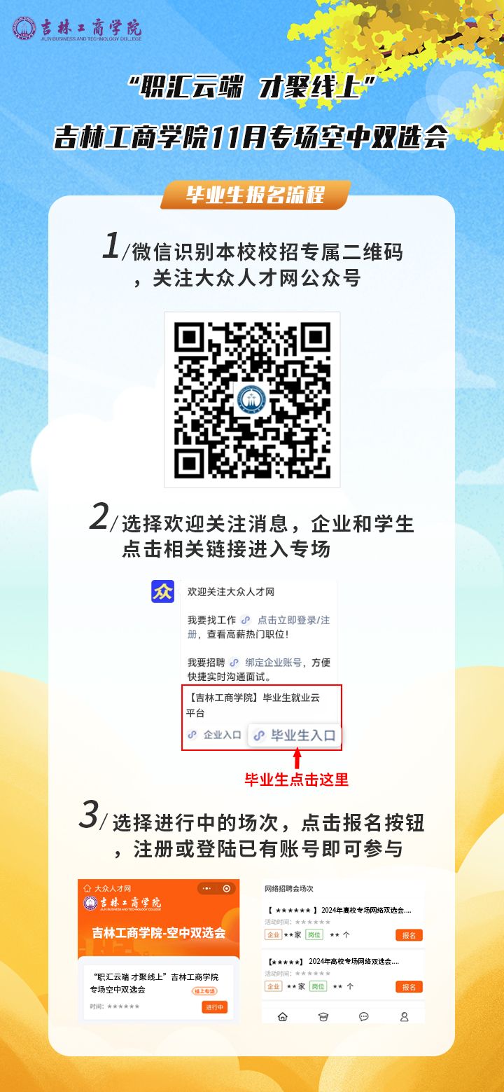手机微信扫码关注“大众人才网”微信公众号,企业和毕业生分别点击相关按钮进入吉林工商学院校招端口,点击报名按钮,注册或登录已有账号即可直接参与。