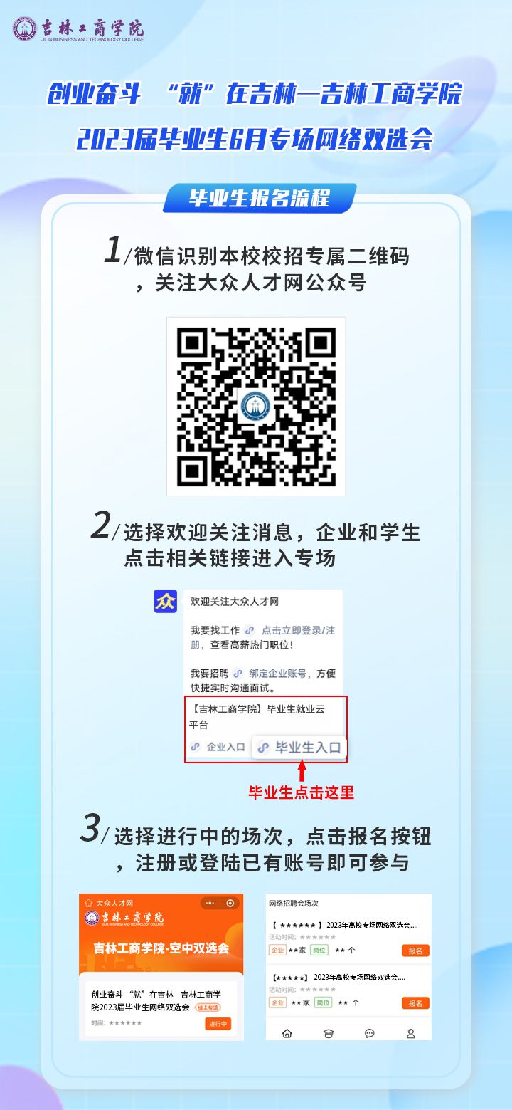 手机微信扫码关注“大众人才网”微信公众号,企业和毕业生分别点击相关按钮进入吉林工商学院校招端口,点击报名按钮,注册或登录已有账号即可直接参与。