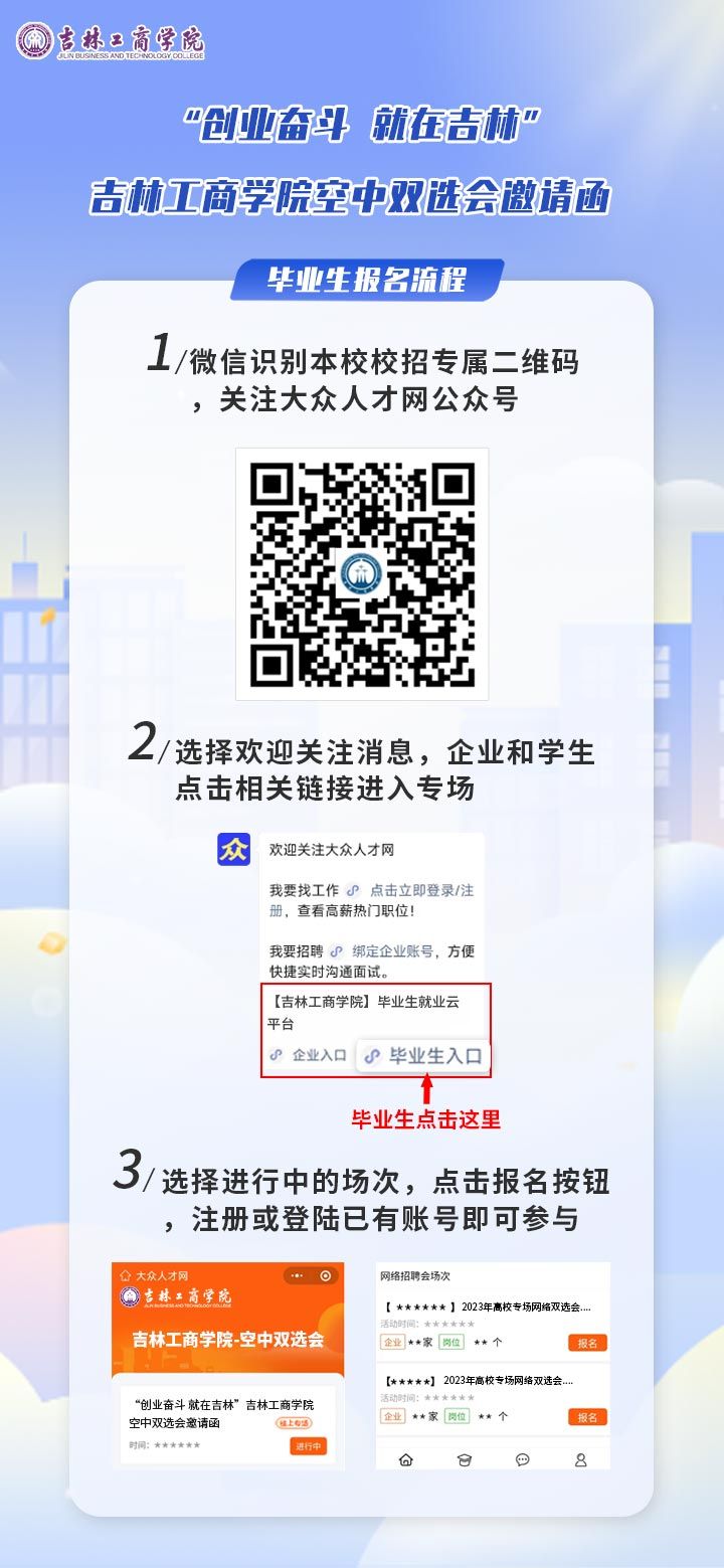 手机微信扫码关注“大众人才网”微信公众号,企业和毕业生分别点击相关按钮进入吉林工商学院校招端口,点击报名按钮,注册或登录已有账号即可直接参与。
