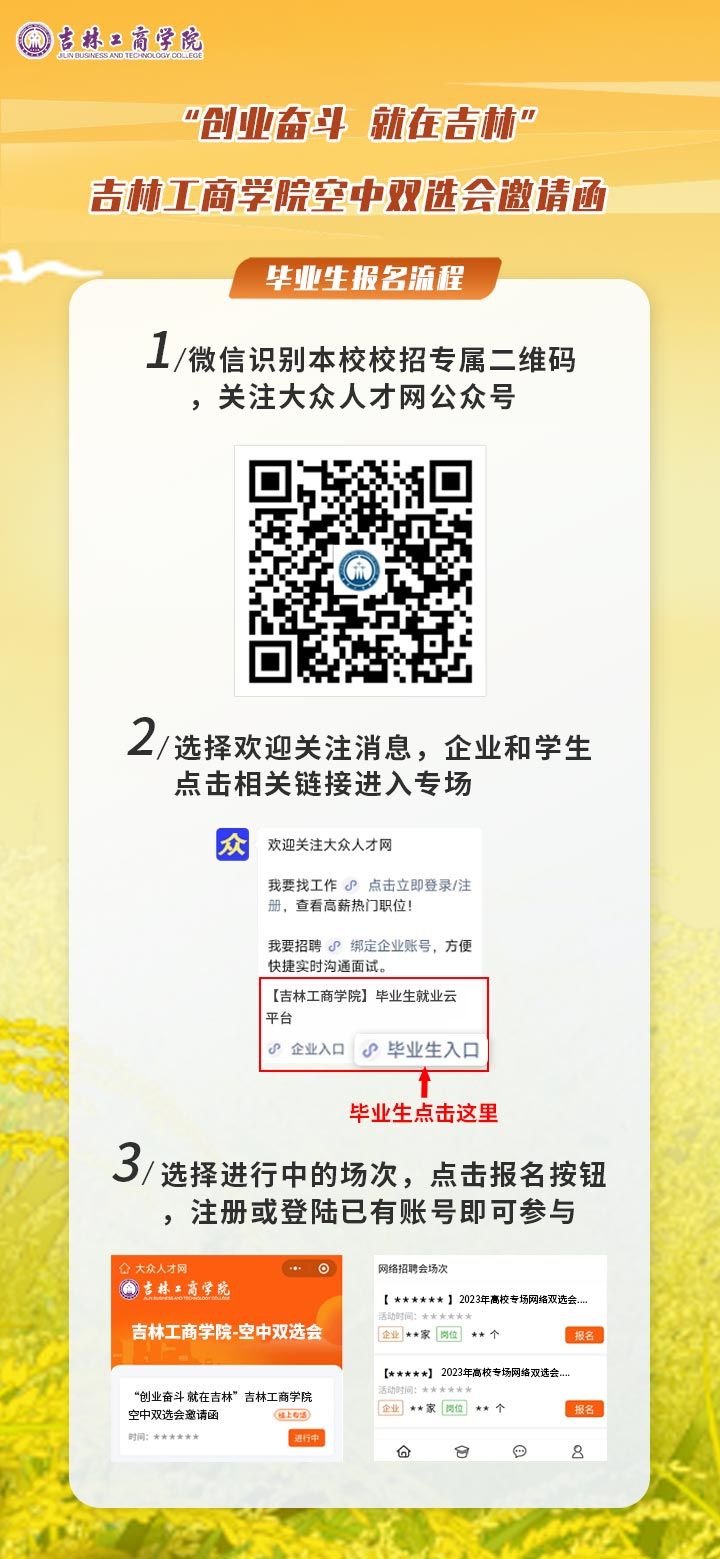 手机微信扫码关注“大众人才网”微信公众号,企业和毕业生分别点击相关按钮进入吉林工商学院校招端口,点击报名按钮,注册或登录已有账号即可直接参与。