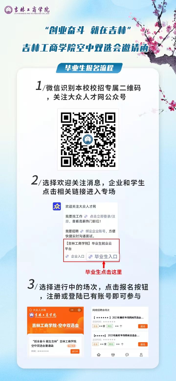 手机微信扫码关注“大众人才网”微信公众号,企业和毕业生分别点击相关按钮进入吉林工商学院校招端口,点击报名按钮,注册或登录已有账号即可直接参与。